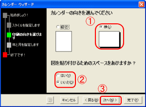 | 「図を貼り付けるためのスペースをあけますか?」とは写真などのスペースをつくるかどうかの質問です。「はい」を選ぶと、出来上がりのカレンダーにイラストが自動で挿入されます。 |