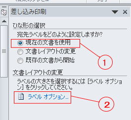 Wordを開き、@『差し込み文書」タブをクリック→A「ラベル」をクリックすると「宛名ラベル作成」が表示されます。